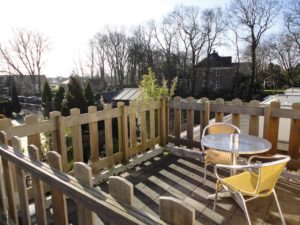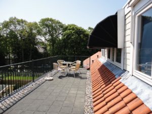 A room, +/- 29 m2, for 2-4 persons with bathroom, roof terrace with two loungers, and view of the garden