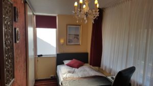 A double room, +/- 14 m2, with bathroom, situated at the front
